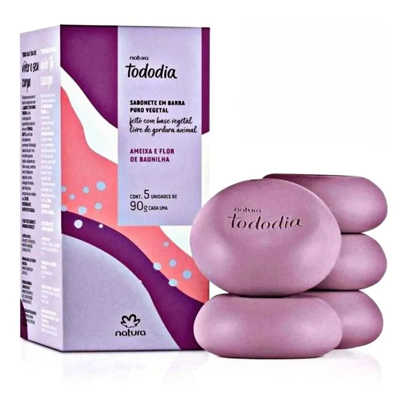 Caixa Sabonte Natura Tododia 5x90g oferece uma experiência sensorial única, com sabonetes que combinam hidratação e fragrâncias encantadoras. Cada barra é formulada para limpar suavemente a pele, deixando-a macia e perfumada. Ideal para uso diário no banho ou como presente especial, este conjunto é perfeito para quem valoriza cuidados pessoais de qualidade.